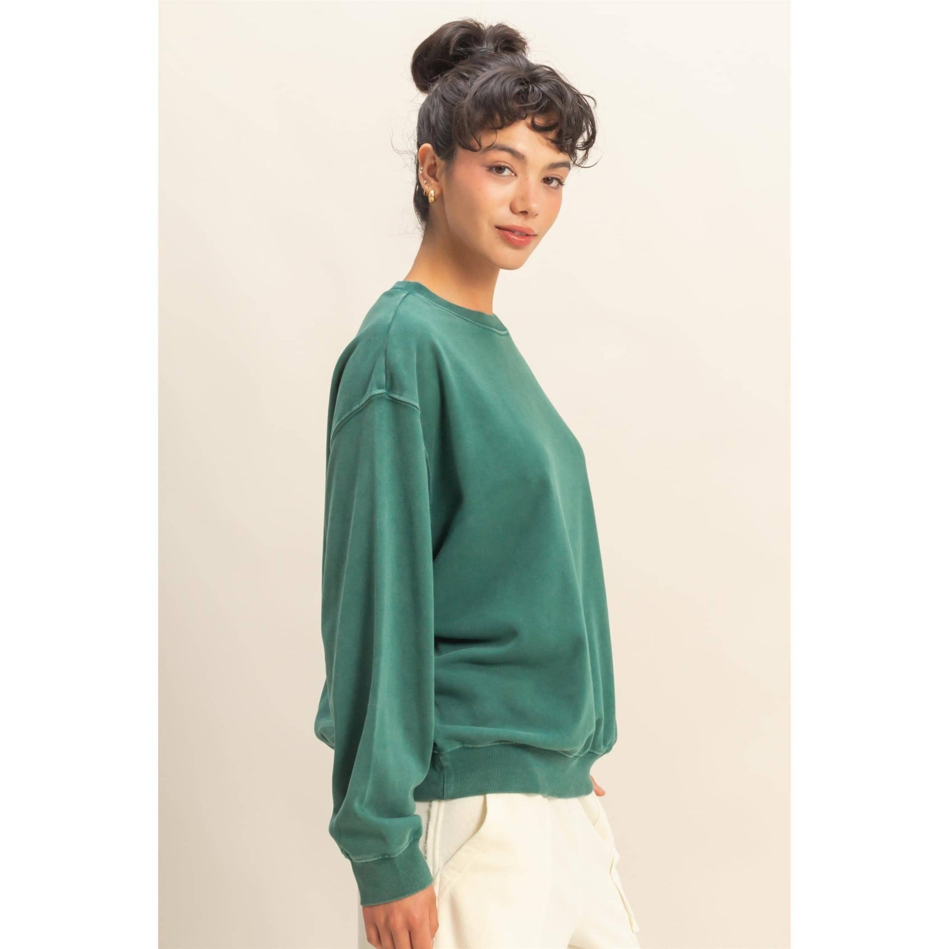 This relaxed-fit oversized sweatshirt features a mineral wash that adds a subtle vintage fade and soft, lived-in feel. A must-have item for casual wardrobes, it pairs effortlessly with jeans or leggings and layers perfectly for fall. Combines comfort with versatile style.